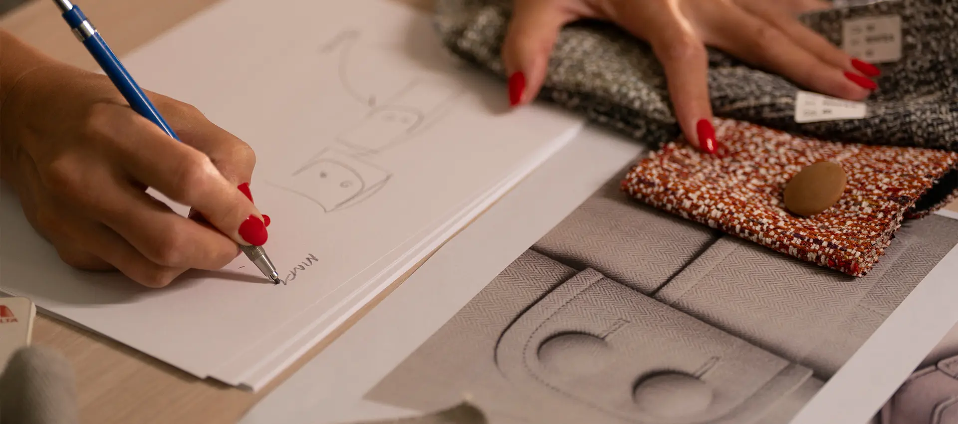 Pelli pregiate conciate in Italia, tessuti naturali dalla texture inconfondibile, dettagli sartoriali curati a mano.