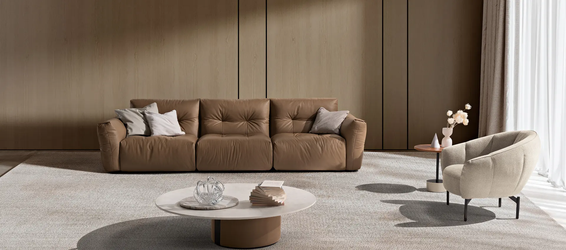 Realizziamo divani, poltrone e letti imbottiti 100% Made in Italy dove artigianalità, design contemporaneo e armonia naturale definiscono un equilibrio senza tempo.