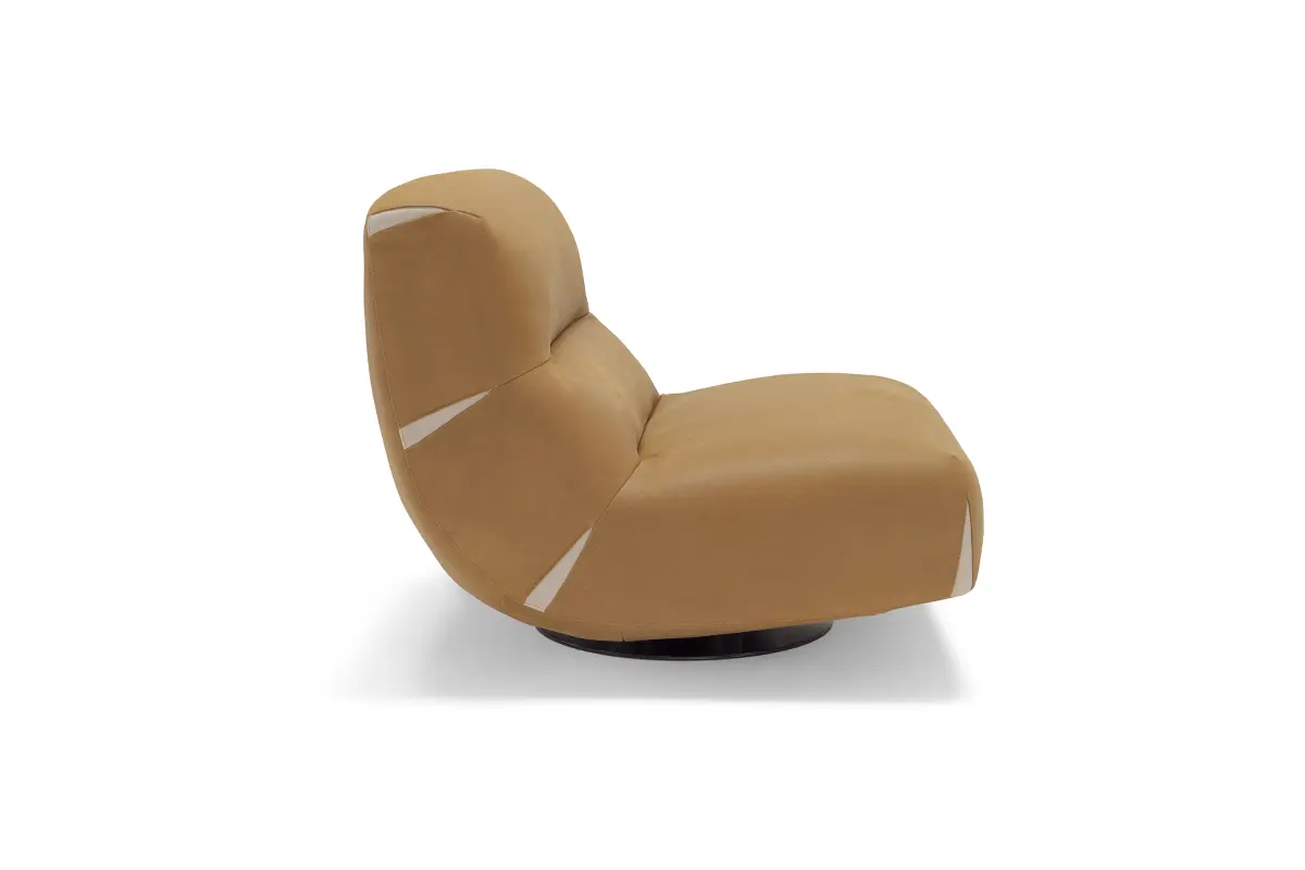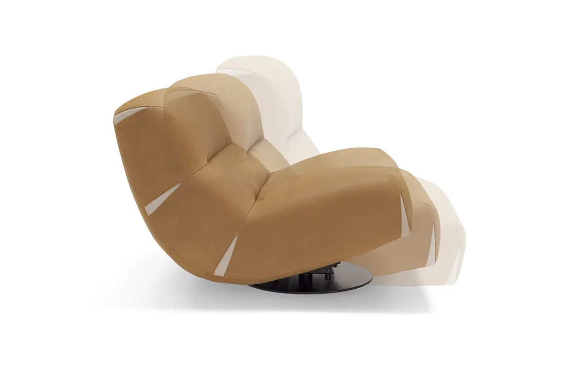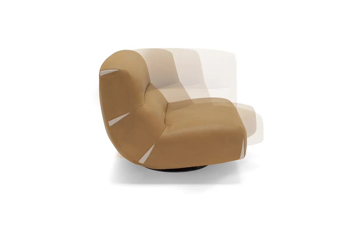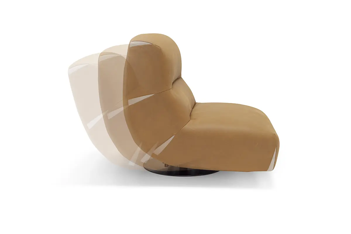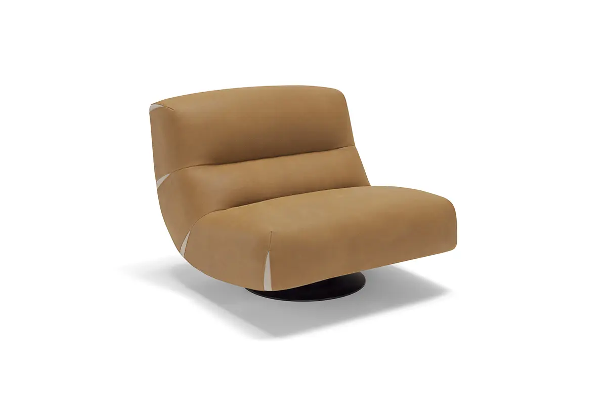Comfy and elegant armchair with swivel and swinging movement, covered in fine nubuck leather with matt black steel base.