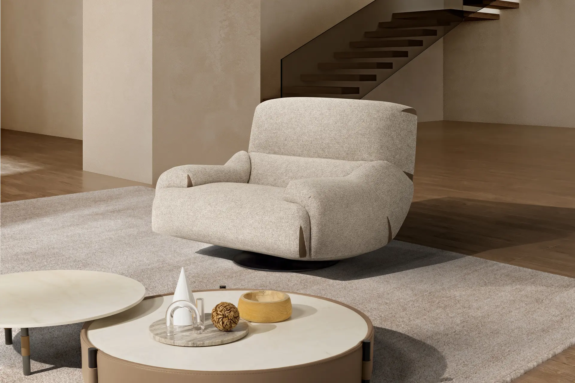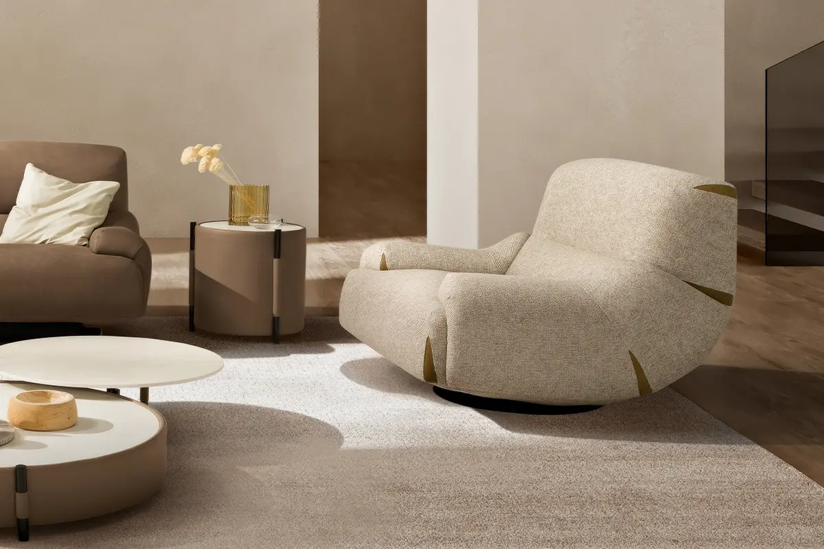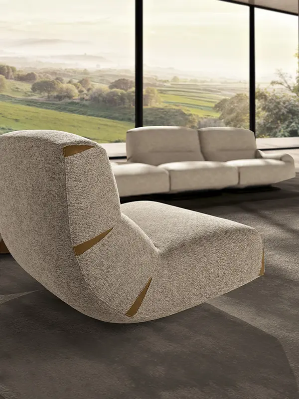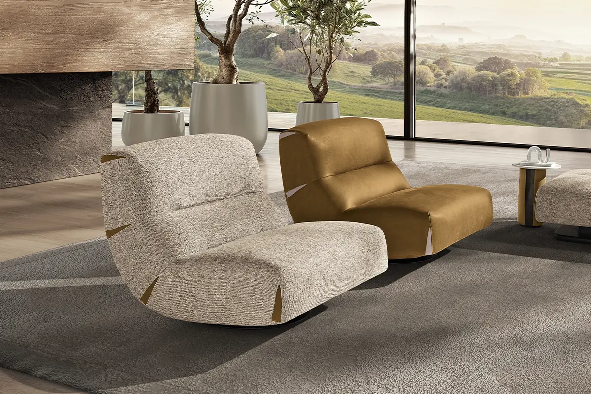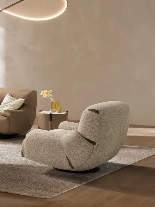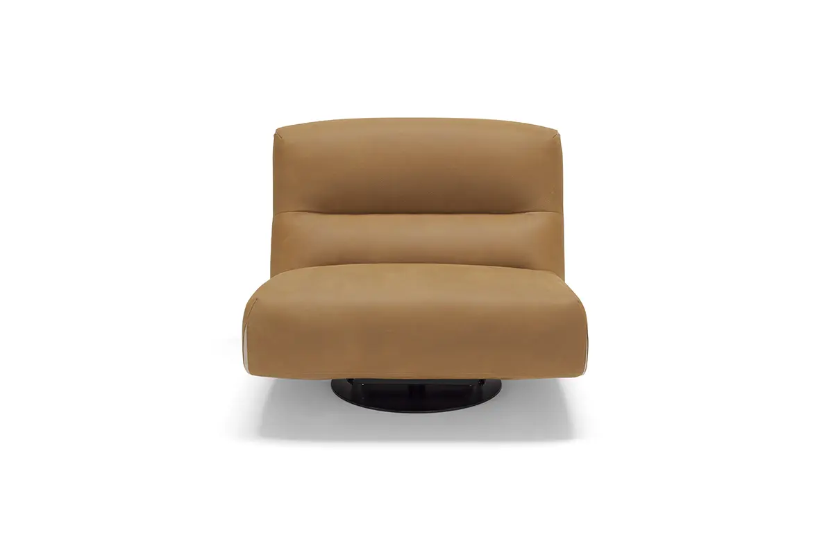Comfy and elegant armchair with swivel and swinging movement, covered in fine nubuck leather with matt black steel base.