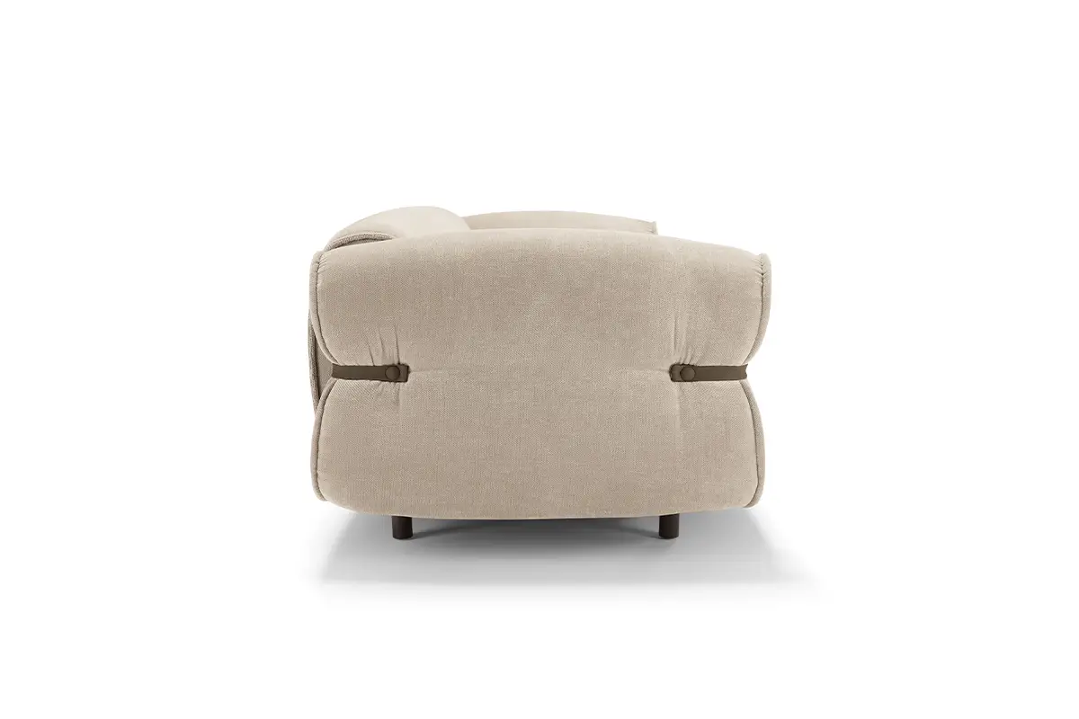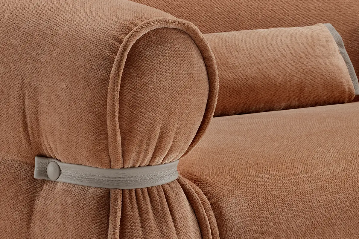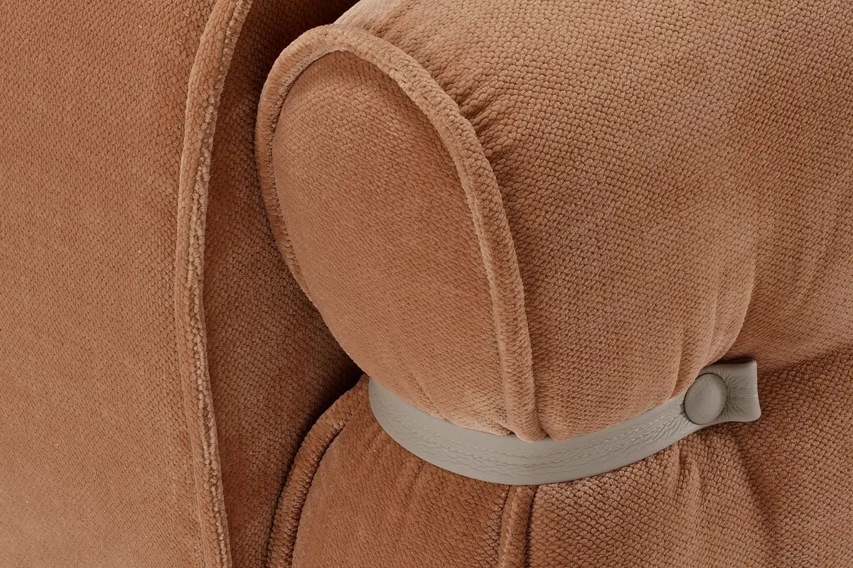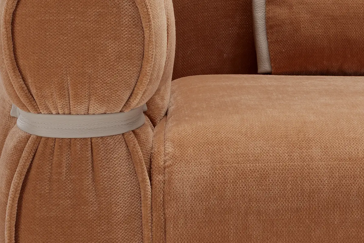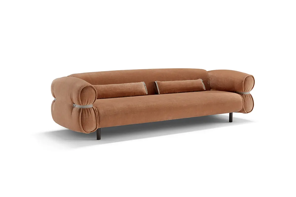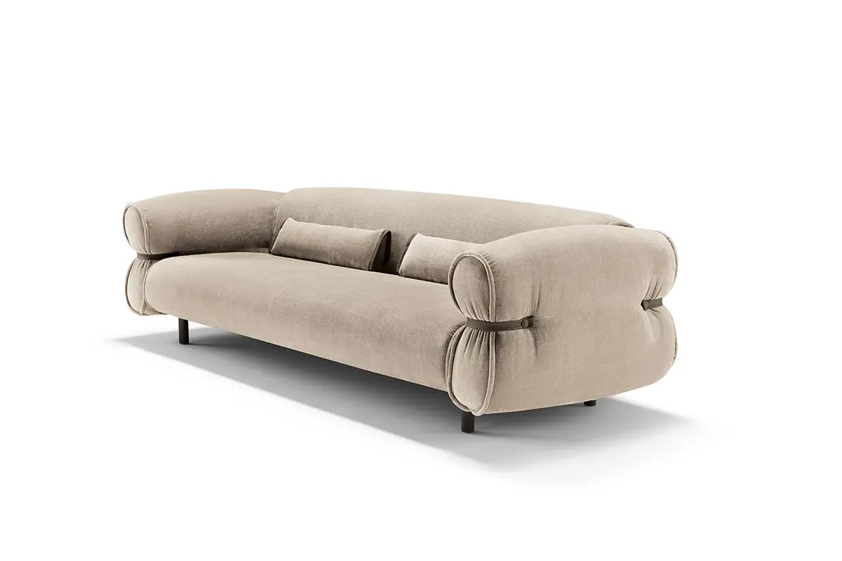 Bon Bon è una presenza che caratterizza gli ambienti con personalità e leggerezza. Il design, elegante e al tempo stesso informale, evoca la forma di una caramella arrotolata, con il particolare estetico di lacci in pelle abbottonati ai lati che stringono i braccioli, esaltando l’unicità della lavorazione artigianale.