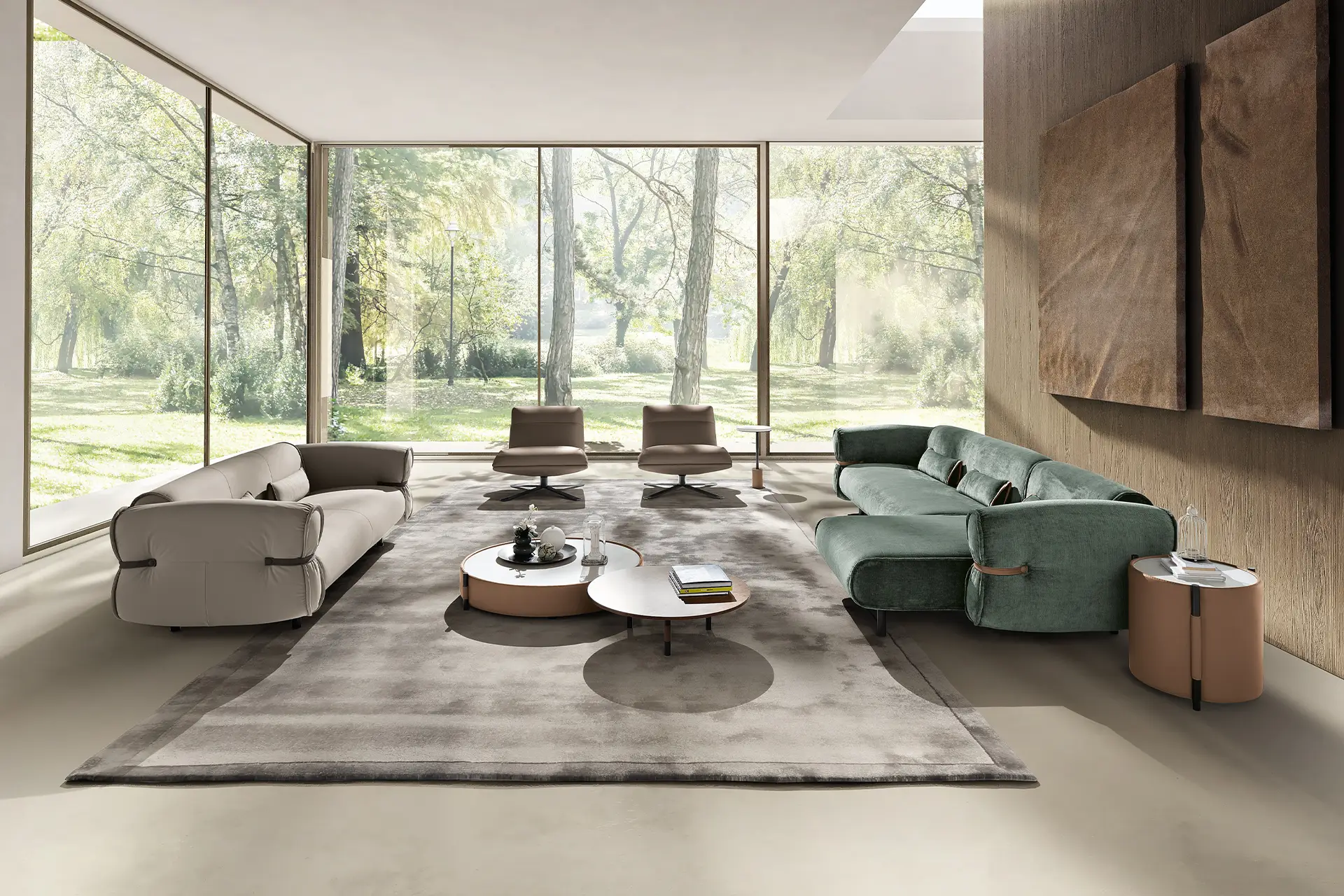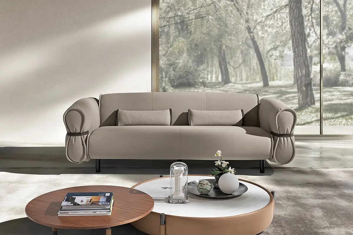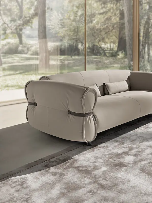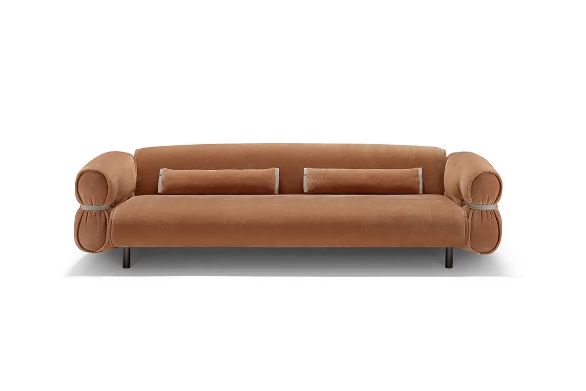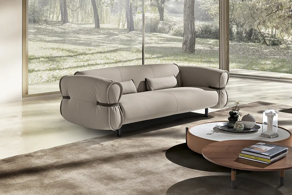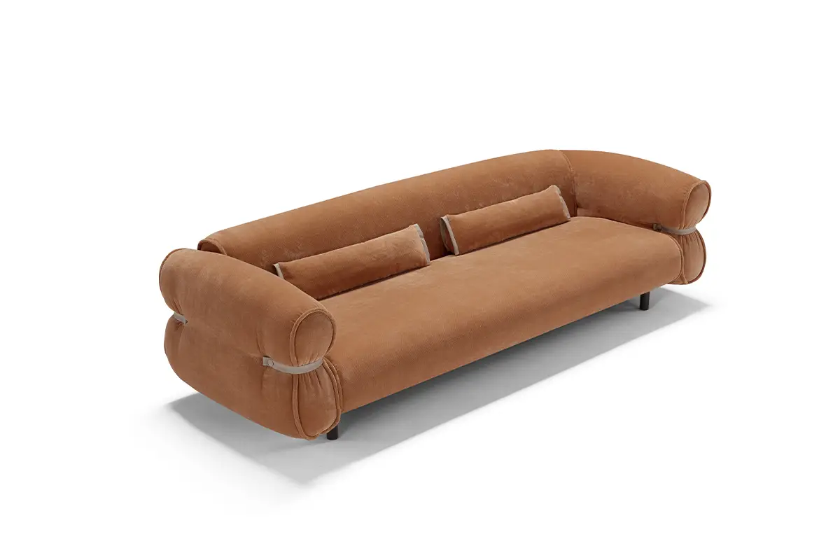 Bon Bon è una presenza che caratterizza gli ambienti con personalità e leggerezza. Il design, elegante e al tempo stesso informale, evoca la forma di una caramella arrotolata, con il particolare estetico di lacci in pelle abbottonati ai lati che stringono i braccioli, esaltando l’unicità della lavorazione artigianale.