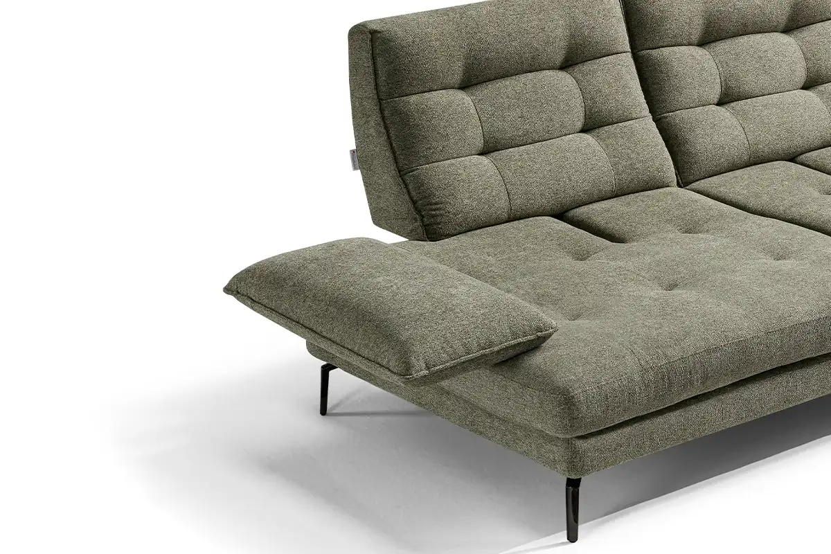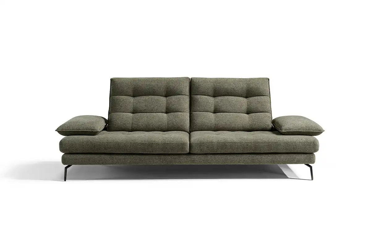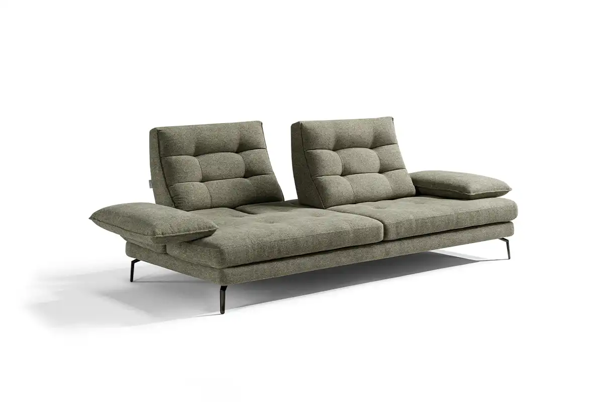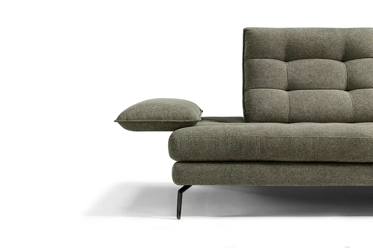 Un divano tre posti “maxi”, caratterizzato da un design ergonomico e da una linea inconfondibile, con 4 meccanismi traslanti su spalliera e braccioli, che creano varie configurazioni ridisegnandolo di continuo. Una sua caratteristica è sicuramente la trapuntatura a quadrotte sia sulla spalliera che sulla seduta, che ne impreziosisce l’immagine. Altro dettaglio particolarissimo è il bracciolo, che ha una sagoma a effetto guanciale con una cucitura pizzicata. I piedini singoli leggermente sagomati, ruotati a 45 gradi, gli donano slancio, leggerezza e anche un ulteriore tocco di eleganza.