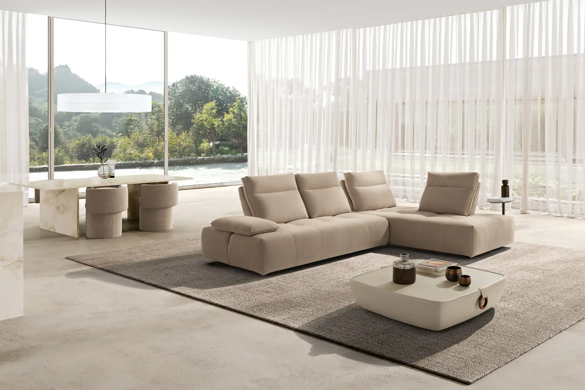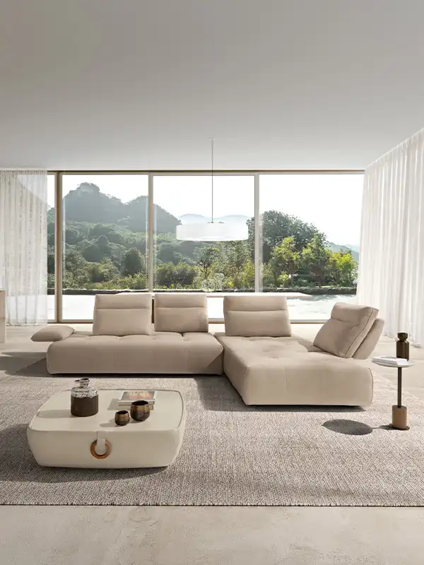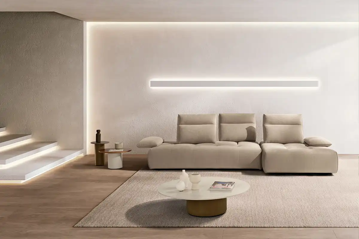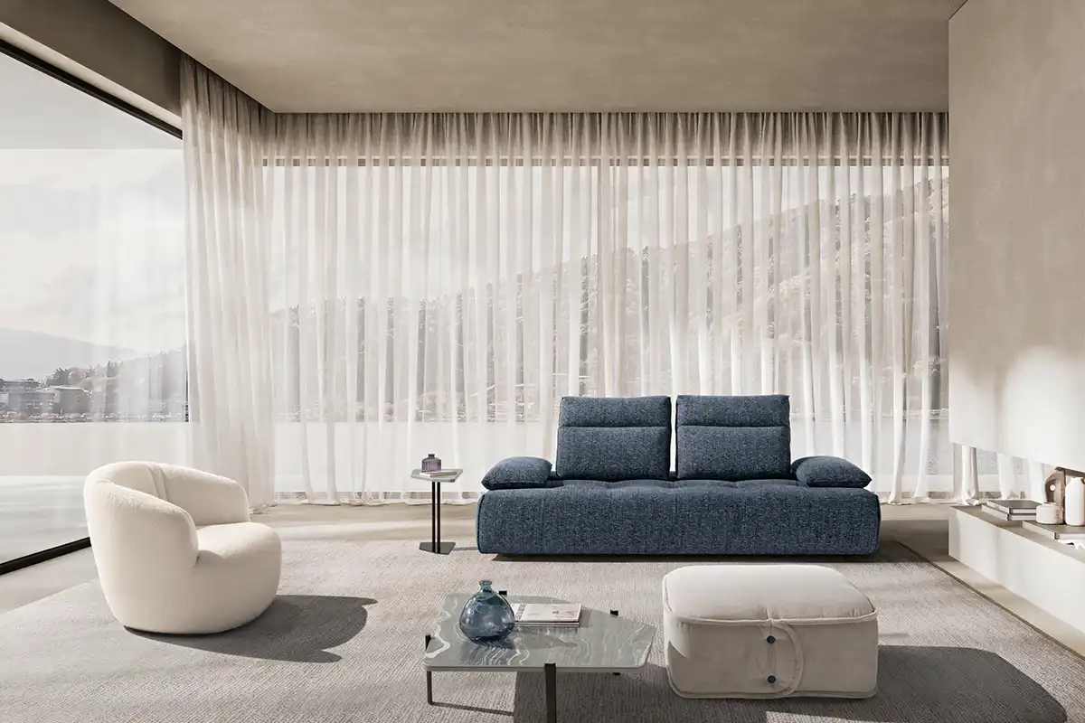 Ideato per assecondare con dinamismo gli spazi e le esigenze della vita contemporanea, il divano modulare Ella, rivestito in tessuto completamente sfoderabile, è un modello che esprime personalità, versatilità e massima libertà compositiva. Partendo da un singolo modulo monoblocco, questo divano può essere infatti declinato in illimitate configurazioni, semplicemente giustapponendo ulteriori moduli rettangolari – chaise longue o penisole terminali – e pouf quadrati. Traslanti orizzontalmente sono sia i braccioli che le spalliere: questo movimento consente di variare la profondità della seduta e di avere un divano in continua evoluzione e mai uguale. La cura sartoriale delle creazioni Maxdivani si esprime infine nella lavorazione trapuntata della seduta e nella cucitura orizzontale presente sullo schienale, a definire un comodo poggiatesta nella parte superiore.