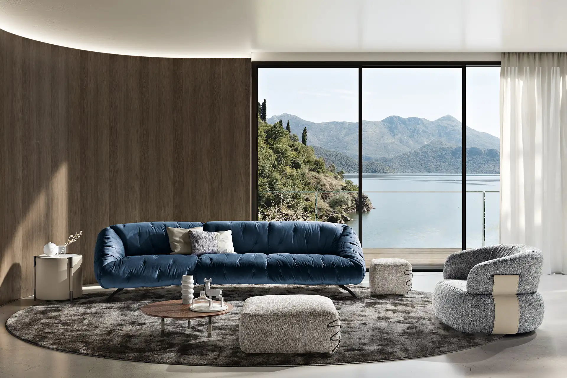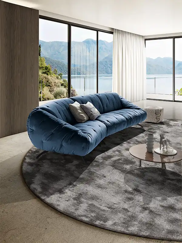 Globo è un sofà caratterizzato da un aspetto informale e dalle linee arrotondate di schienale e braccioli che accentuano morbidezza e dinamicità. La seduta è soffice e profonda. La raffinata trapuntatura del rivestimento è visibile a 360° su tutta la superficie e lo rende perfetto da ammirare al centro della stanza.