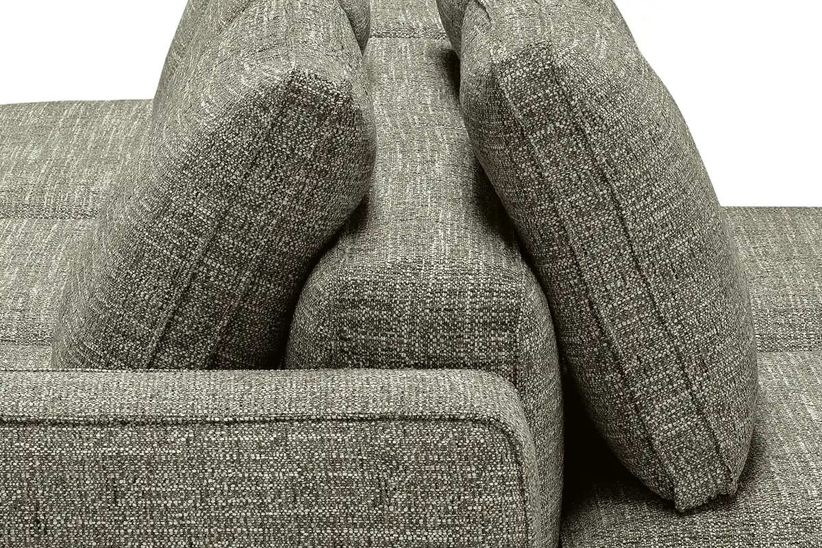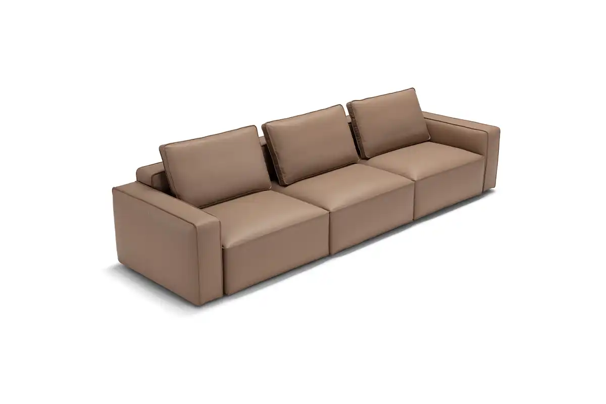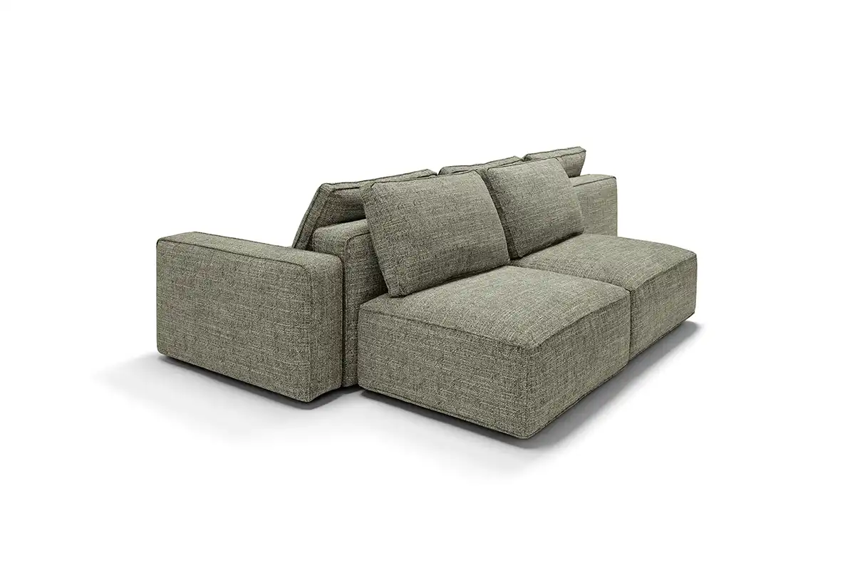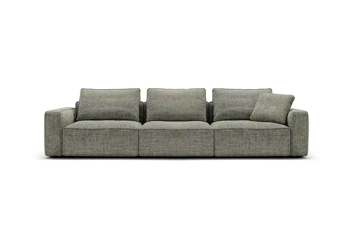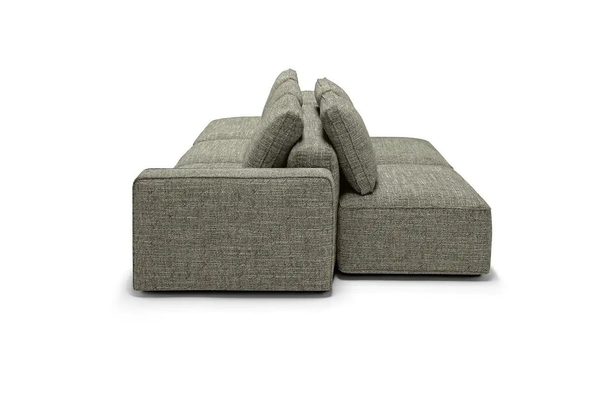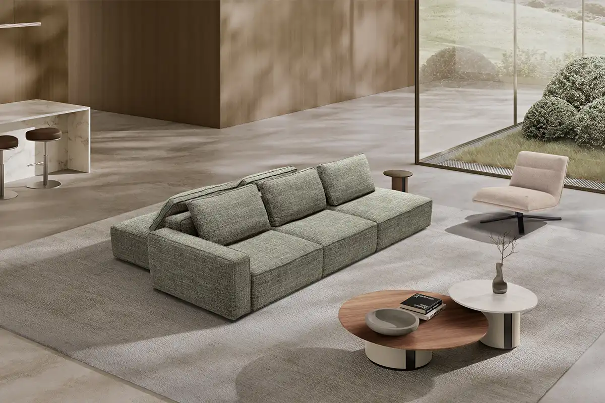 Destinato ad interpretare un ruolo da protagonista nella zona living, il divano modulare quattro posti Raja si presta con dinamismo ad un’ampia possibilità di configurazioni, pronte ad accogliere tutte le attività della vita di ogni giorno. Perfetto da collocare in un open space nella sua versione bifacciale, è un modello che si impone per i suoi volumi definiti e rigorosi, cui fanno da contrappunto le soffici spalliere amovibili imbottite in pregevole piuma d’oca. Proposto con rivestimento in tessuto sfoderabile o in pelle, Raja può essere ulteriormente impreziosito grazie all’inserimento di un pouf con ripiano in noce canaletto.