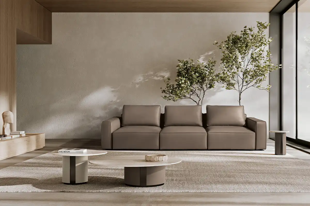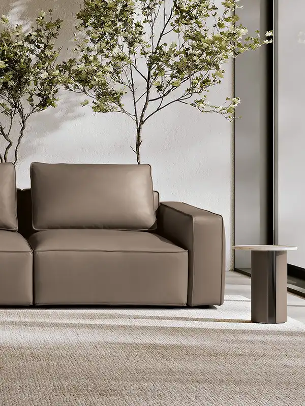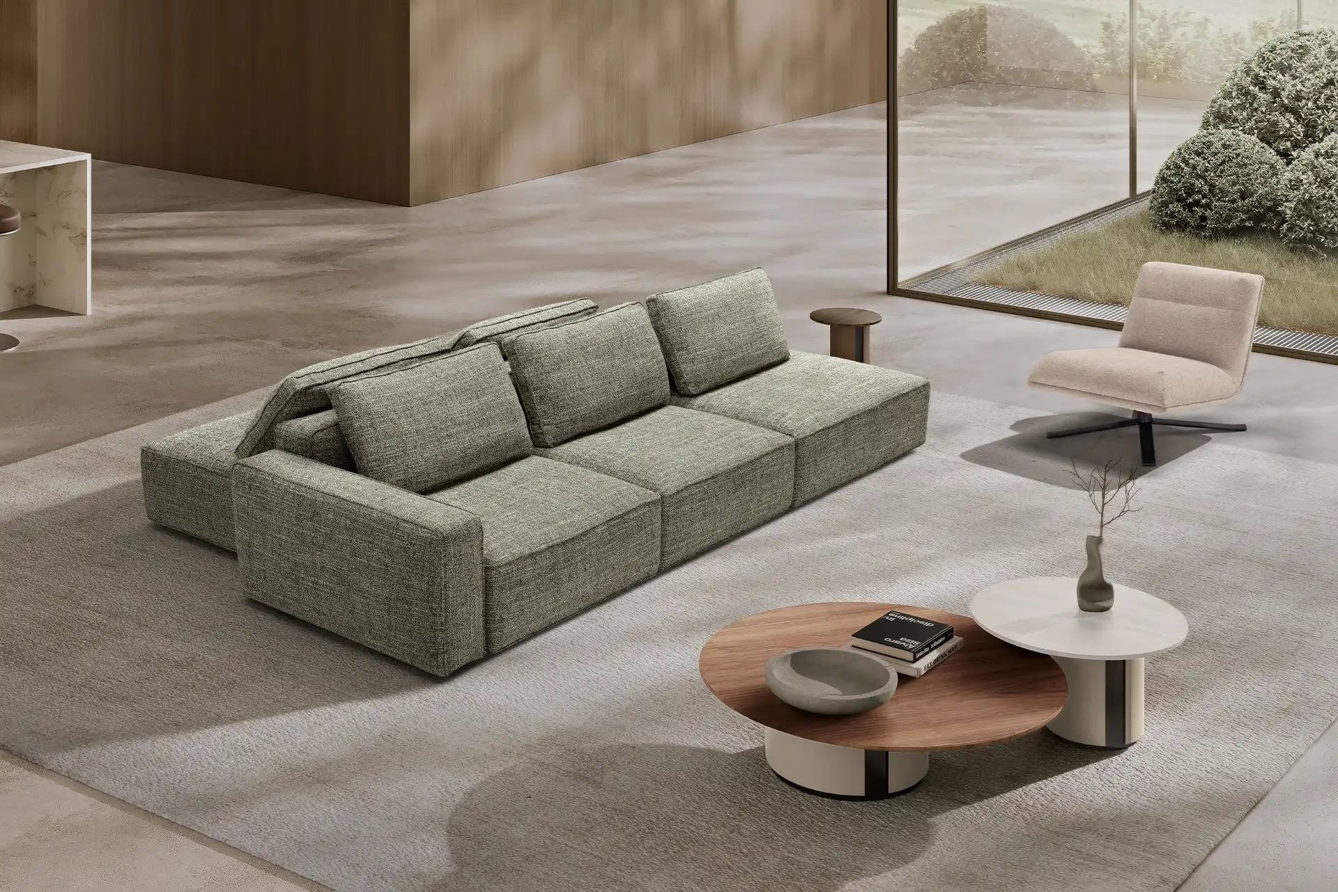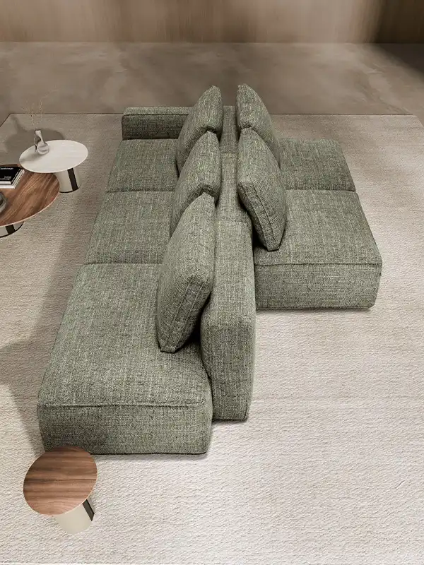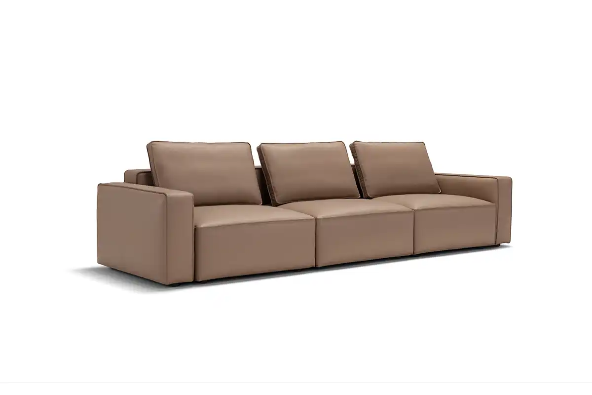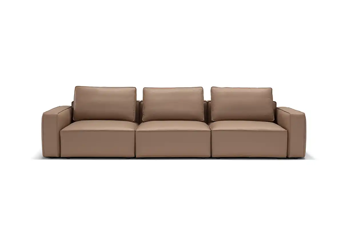 Destinato ad interpretare un ruolo da protagonista nella zona living, il divano modulare quattro posti Raja si presta con dinamismo ad un’ampia possibilità di configurazioni, pronte ad accogliere tutte le attività della vita di ogni giorno. Perfetto da collocare in un open space nella sua versione bifacciale, è un modello che si impone per i suoi volumi definiti e rigorosi, cui fanno da contrappunto le soffici spalliere amovibili imbottite in pregevole piuma d’oca. Proposto con rivestimento in tessuto sfoderabile o in pelle, Raja può essere ulteriormente impreziosito grazie all’inserimento di un pouf con ripiano in noce canaletto.