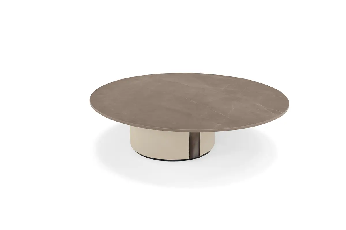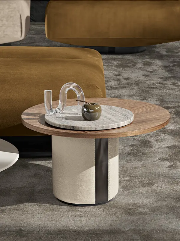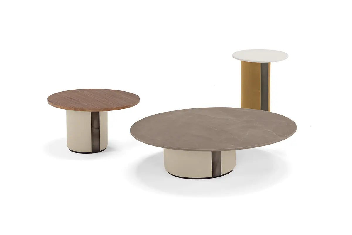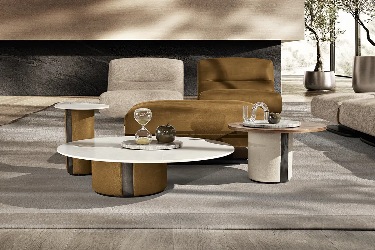 La combinazione ideale di forme e materiali, ripiani in gres e legno, strutture rivestite in tessuto e pelle e dettaglio in acciaio, tantissime combinazioni di colori per ogni esigenza di gusto.